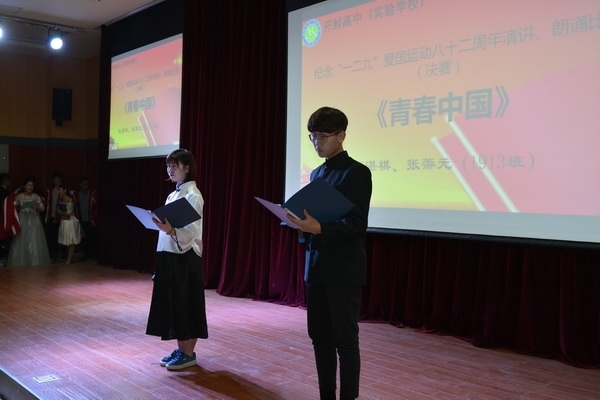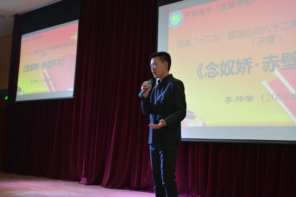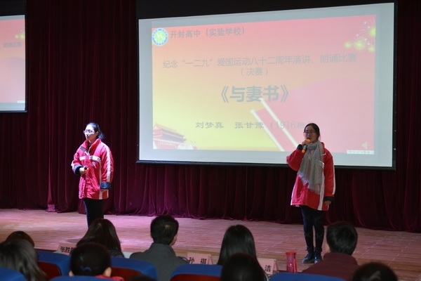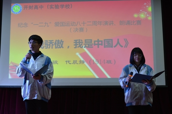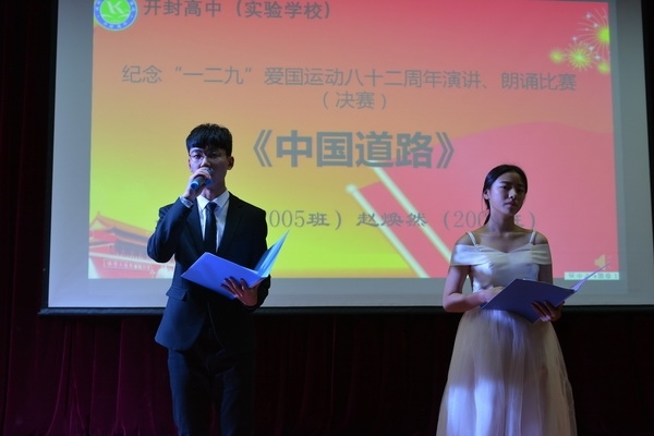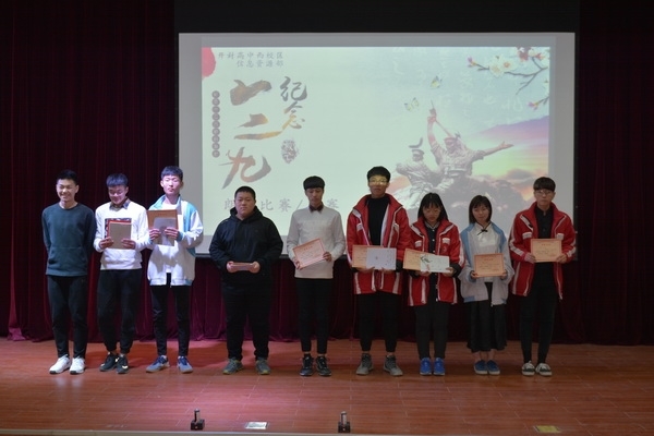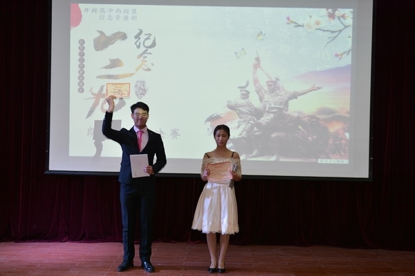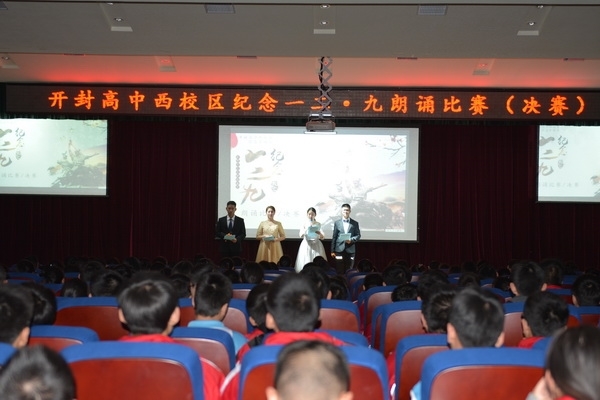 本次比赛高一、高二年级共有89个节目报名参赛,经过初赛的筛选,最终10个节目进入决赛。2017年12月8日,开封高中西校区纪念“一二九”爱国运动八十二周年演讲、朗诵比赛决赛在报告厅举行,比赛共决出特等奖2个,一等奖3个,二等奖5个,优秀奖15个,优秀组织奖8个。我校副校长宋全会、校务委员李沛、王新国、西校区综合办主任张志强观看了决赛,比赛结束后宋全会副校长做了简短的总结,几位校领导为获奖选手颁发了证书和纪念品。